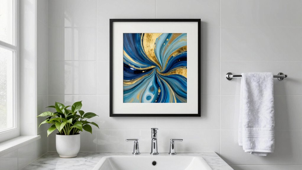 Choose high-quality glass or acrylic that resists scratches and UV rays to guarantee long-lasting protection. With these measures, you can enjoy your art without worrying about moisture damage or fading, keeping your bathroom decor looking fresh and vibrant for years to come.