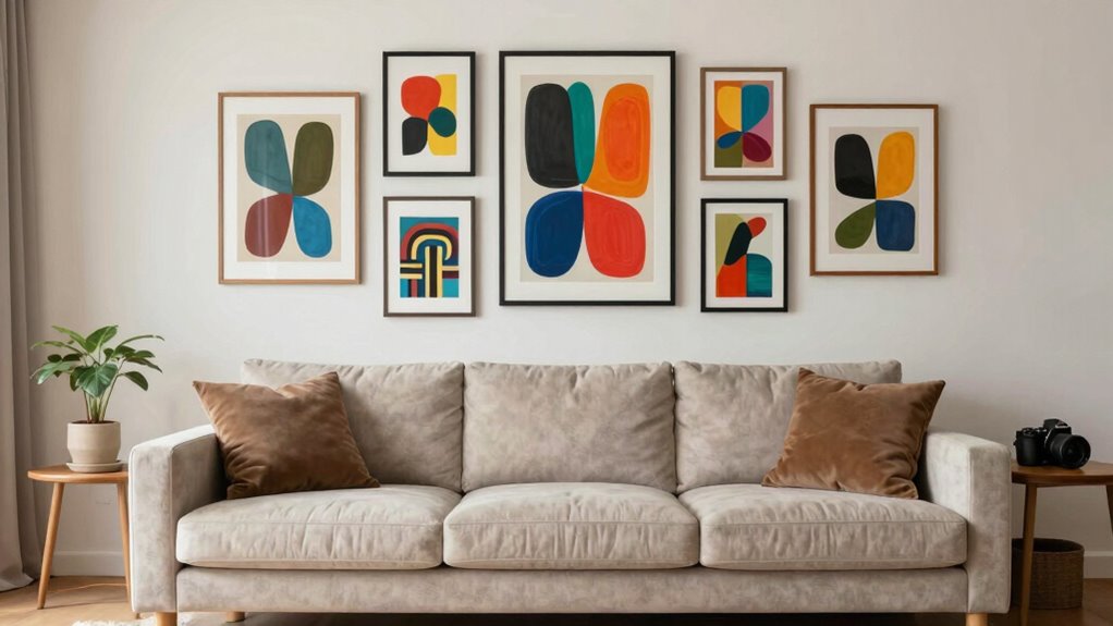 When arranging multiple art pieces, you want to balance different sizes and shapes to keep the display visually appealing. Using consistent frames helps create a unified look, even with varied artwork. Focus on harmonizing these elements for a cohesive, polished arrangement above your sofa. Incorporating visual balance techniques can further enhance the overall aesthetic and prevent the display from appearing cluttered or too small. Additionally, paying attention to proportionality ensures that artwork complements the size of your sofa and space, making the arrangement feel intentional and well-scaled. Considering lighting can also highlight your artwork and add depth to your display, making it more engaging and well-curated. Experimenting with spacing can help you achieve a balanced and inviting visual flow. Incorporating visual balance strategies can help you distribute visual weight evenly across your arrangement, creating harmony among the pieces.