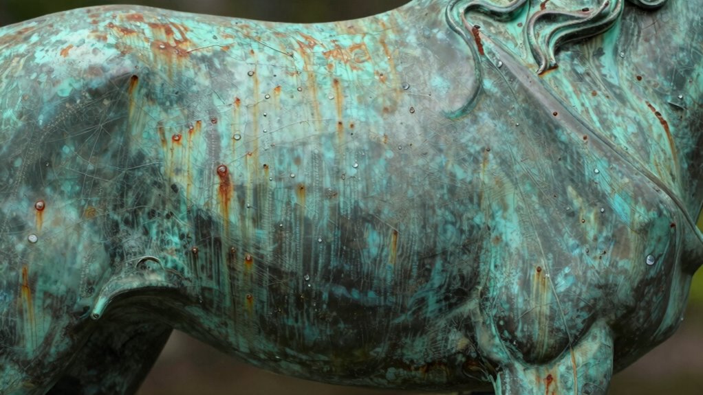 You’ll notice early rust or patina deterioration through rust bubbles that form on the surface and discoloration patches that change the sculpture’s original hue. These signs indicate moisture exposure and oxidation begin to break down the metal.