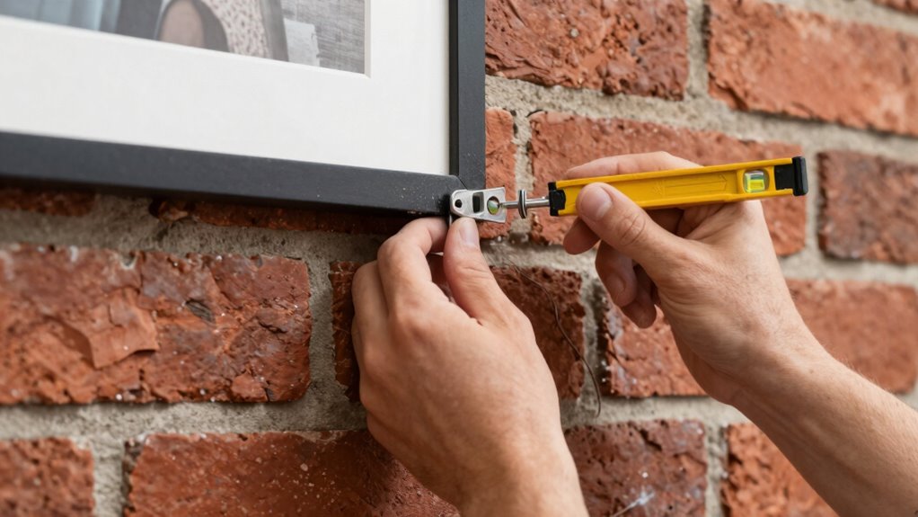 Choosing the right anchors is essential for supporting heavy art on brick and concrete. You’ll need to use proper drilling techniques to prevent damage and make certain of secure placement.