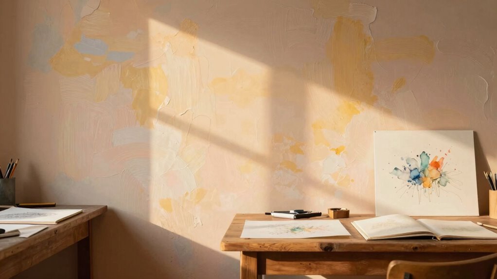 Have you ever wondered why art rooms often feel more inviting and comfortable than other classrooms? It’s not just about the supplies or the creative energy buzzing in the air. A big part of it comes down to how the space is designed—specifically, the colors on the walls and the lighting that illuminates the room. These elements tap into subtle psychological cues that influence how you feel when you step inside. Color psychology plays a vital role here, as the hues on the walls can evoke specific emotions and set the tone for creativity. Soft, warm tones like gentle yellows or calming blues tend to create a welcoming atmosphere, making you feel relaxed and open to experimenting. Bright, energetic colors like reds and oranges can boost enthusiasm and stimulate your artistic instincts, encouraging bold ideas and confident strokes. When the walls reflect the right colors, they subtly influence your mood, helping you feel more comfortable and inspired. The placement and quality of lighting also play a crucial role in shaping the room’s ambiance, further enhancing the overall environment. Incorporating biodiversity elements into the decor can subtly enhance feelings of well-being and connection to nature, further boosting creativity. Additionally, the choice of natural or sustainable materials can reinforce this connection and promote a sense of harmony within the space. Thoughtful lighting design can also help reduce visual discomfort and support longer periods of focused work. The way a room is lit can make a huge difference in how inviting it feels. Well-placed, natural light or warm artificial lighting can soften the space, reducing harsh shadows that might cause discomfort or eye strain. Good lighting isn’t just about visibility; it’s about creating an environment that feels alive and dynamic. When the lighting complements the wall colors, it enhances the overall ambiance, making the room feel more open and inviting. Bright, evenly distributed light helps you focus on your work without distraction, while softer lighting can foster a sense of calm that’s perfect for reflection and detailed projects. The combination of thoughtful lighting design and color choices creates a space where you’re more likely to feel at ease, less stressed, and more willing to take creative risks. Recognizing the impact of environmental cues can help in designing spaces that promote maximum comfort and inspiration. Carefully considering these elements can transform an ordinary room into a creative sanctuary that nurtures artistic growth.