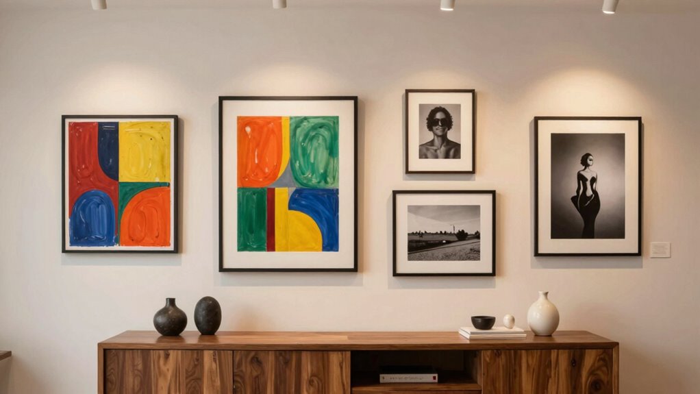 You should choose accent lighting with a warm color temperature to highlight your art without overpowering it. Opt for adjustable spotlights or track lighting that allow you to direct light precisely. Avoid harsh, bright lights that can cause glare or color distortion. By balancing accent lighting with the right color temperature, you create a gallery-like atmosphere that enhances your artwork’s beauty and makes your display inviting and professional.