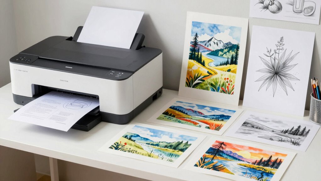Additionally, consider the cost and maintenance associated with different printer sizes, as larger models typically require more investment in upkeep but can offer expanded creative possibilities. In essence, picking the right printer size involves evaluating your typical artwork dimensions, making sure it supports the paper types you prefer, and confirming ink compatibility for your desired outcomes. Larger printers open up possibilities for bigger, more detailed projects, but they come with higher costs and maintenance needs. Smaller models are more portable and budget-friendly, suited for personal use or smaller pieces. By considering these factors carefully, you guarantee your printer enhances your creative process, producing high-quality results that truly reflect your artistic vision.
