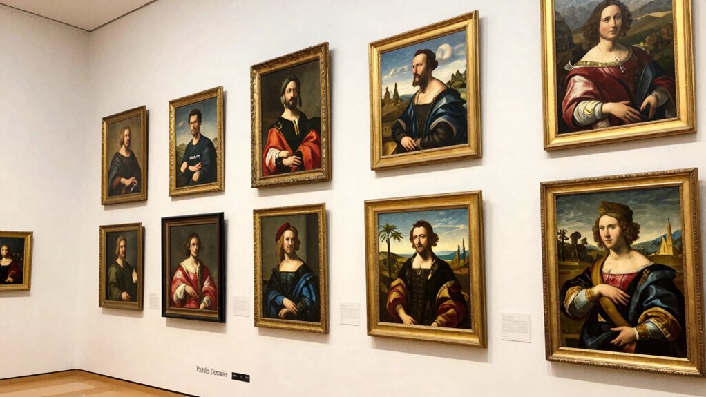 Public domain works are creative pieces that are no longer protected by copyright, meaning you can freely use, share, or adapt them. Old art, music, or writings often enter the public domain after copyright expires, which typically happens after a certain number of years. To know for sure if an artwork is free to use, you should verify its status and sources. Keep exploring to learn more about how these works become available for everyone.