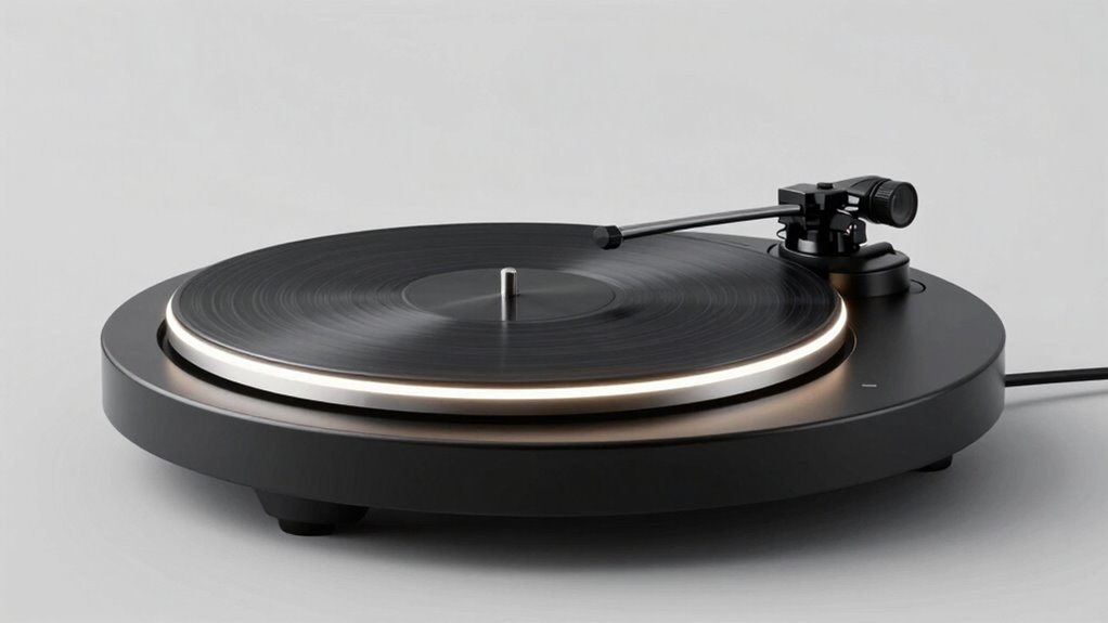 Since noise levels can substantially impact the quality of your studio work, it’s essential to choose a turntable that operates quietly enough to avoid distractions or interference. In a professional setting, turntables with noise levels below 50 dB are ideal, ensuring minimal disturbance during shoots or recordings. Look for models with brushless motors and vibration-dampening features, as these help keep noise to a minimum and produce smooth, stable rotations. Some high-end options specify noise levels as low as 45 dB or less, making them perfect for noise-sensitive environments like recording studios or customer-facing displays. Prioritizing low noise levels guarantees your product photography remains distraction-free and that audio recordings stay clean, ultimately elevating the quality of your studio work.