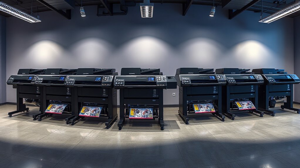 When choosing a 44-inch wide format printer, paying close attention to speed and efficiency is essential for maintaining a smooth workflow. I evaluate the maximum print speed in pages or square feet per hour to guarantee it meets my production demands. I also consider warm-up times, media loading, and job processing, as these impact overall efficiency. Features like automatic media switching and auto-nesting help reduce manual effort and speed up large or complex jobs. Adequate RAM and processing power are critical for handling high-resolution files quickly without delays. Additionally, I look for robust connectivity options such as Ethernet, USB, and Wi-Fi, which enable seamless job submission and remote management. Prioritizing these factors ensures faster turnaround times and improved productivity.