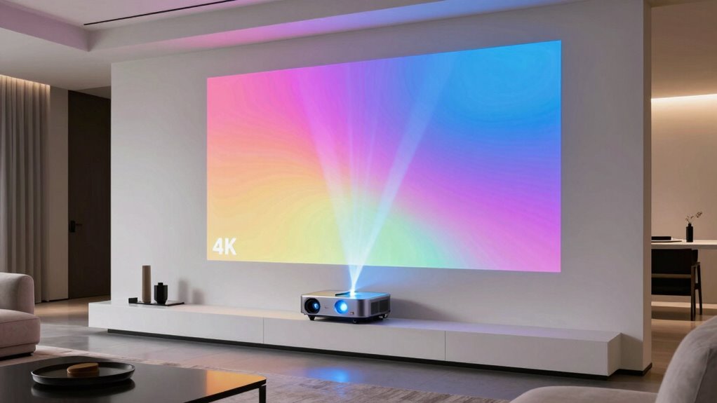 Smart connectivity features are essential for getting the most out of your 4K laser short throw projector, as they guarantee seamless access to content and effortless device integration. Look for projectors with built-in platforms like Android TV or Google TV, which give you instant access to streaming apps like Netflix, YouTube, and Prime Video without extra devices. Wireless options like WiFi and Bluetooth make sharing content and pairing devices simple and cable-free. Integrated casting features such as Chromecast or AirPlay enable you to stream directly from smartphones, tablets, or computers with ease. Compatibility with voice assistants like Google Assistant or Alexa allows for hands-free control and smart home integration. Also, multiple HDMI and USB ports ensure you can connect gaming consoles, soundbars, or streaming sticks effortlessly.