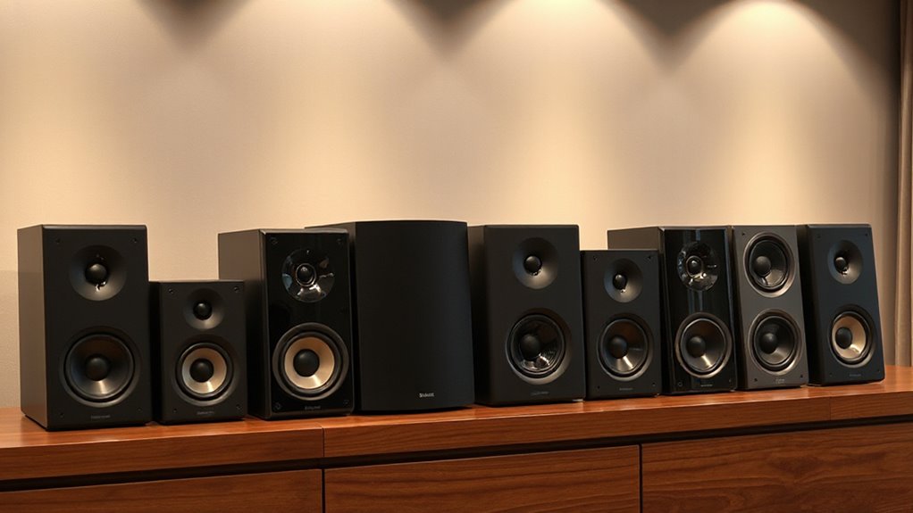 When selecting bookshelf speakers, size and available space play a significant role in ensuring they fit well into your environment and perform ideally. Measure your space carefully, considering the height, width, and depth of potential speakers to avoid overcrowding. Larger models with bigger drivers need more room to prevent sound distortion and maintain clarity, so they’re best suited for bigger areas. Conversely, compact speakers are perfect for smaller rooms or desks, where space is limited and discreet placement matters. Make sure there’s enough clearance around the speakers for proper airflow, which helps preserve sound quality. Also, consider their placement height and proximity to walls, as close positioning can influence bass response and overall sound performance.