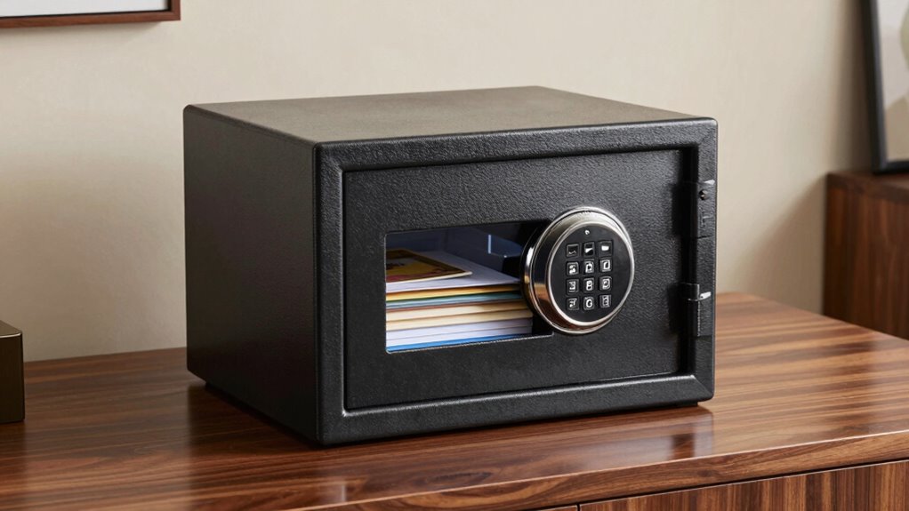 When evaluating fireproof safes for art documents, security features are just as important as their material durability. I look for safes with advanced locking mechanisms like digital keypads, combination locks, or quality keys, which help prevent unauthorized access. Tamper-resistant features, such as pry-resistant hinges and reinforced locking bolts, add extra security. It’s also essential that the safe can be securely anchored to a wall or floor, with pre-drilled holes for bolting, deterring theft through removal. I check that the lock system includes backup options, like spare keys or override codes, in case of electronic failure. Finally, I prioritize safes with certification from standards organizations like UL or ETL, ensuring their security features meet rigorous safety tests.