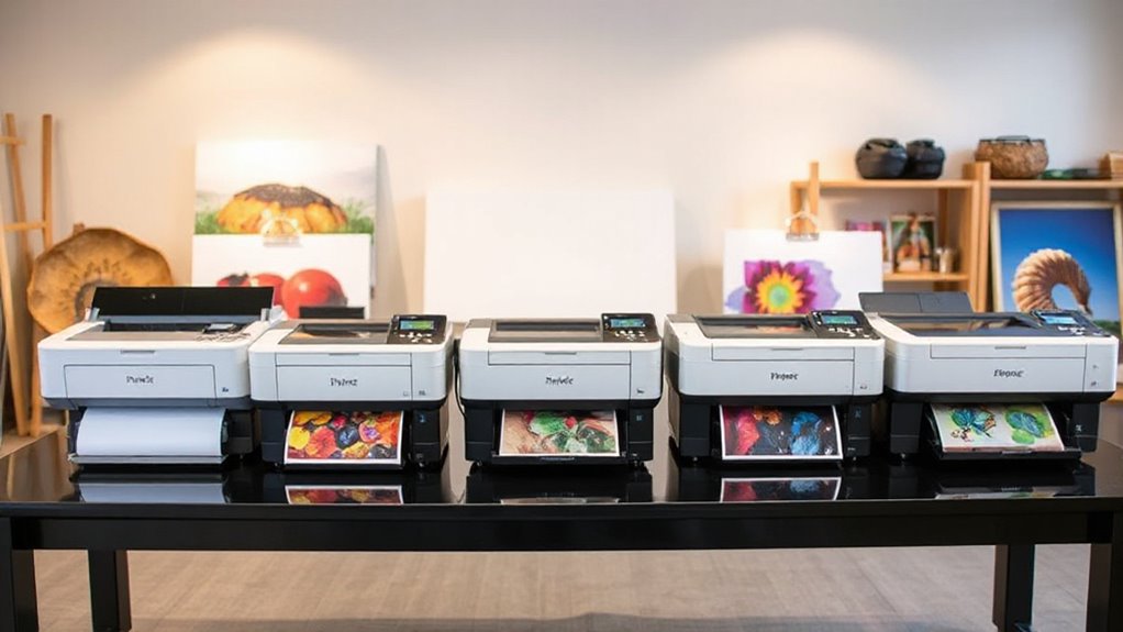 Ink longevity and archival quality vary considerably among these printers. I’ve found that printers using pigment-based inks typically offer much longer-lasting prints, often exceeding 100 years without fading, compared to dye-based inks. Additionally, high-quality paper and proper storage can enhance longevity. I always choose printers with proven archival ink technologies to guarantee my artwork remains vibrant and preserved over time, giving me peace of mind about my prints’ durability.