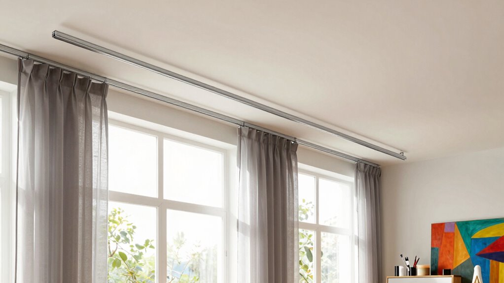 Motorized curtain tracks are like talented dancers—they handle different curtain weights and fabrics with grace. I’ve found that most tracks are adjustable, making them suitable for lightweight sheers or heavier blackout curtains. Just make certain you choose a track designed for your specific fabric weight. When properly matched, they smoothly glide, transforming your art room into a flexible space that adapts effortlessly to your needs.
