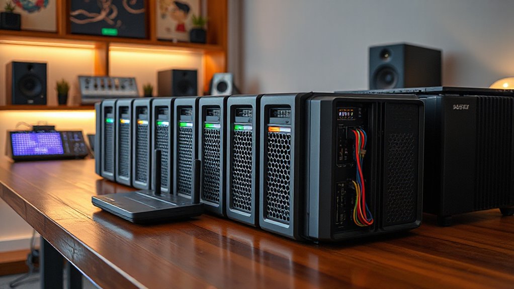 When selecting NAS storage for your studio backups, I focus on your storage capacity needs and how much data you’ll be managing. I also consider the security measures to keep your files safe and the network speed required for quick access. Finally, I look at backup automation options and device compatibility to guarantee a smooth, dependable setup.