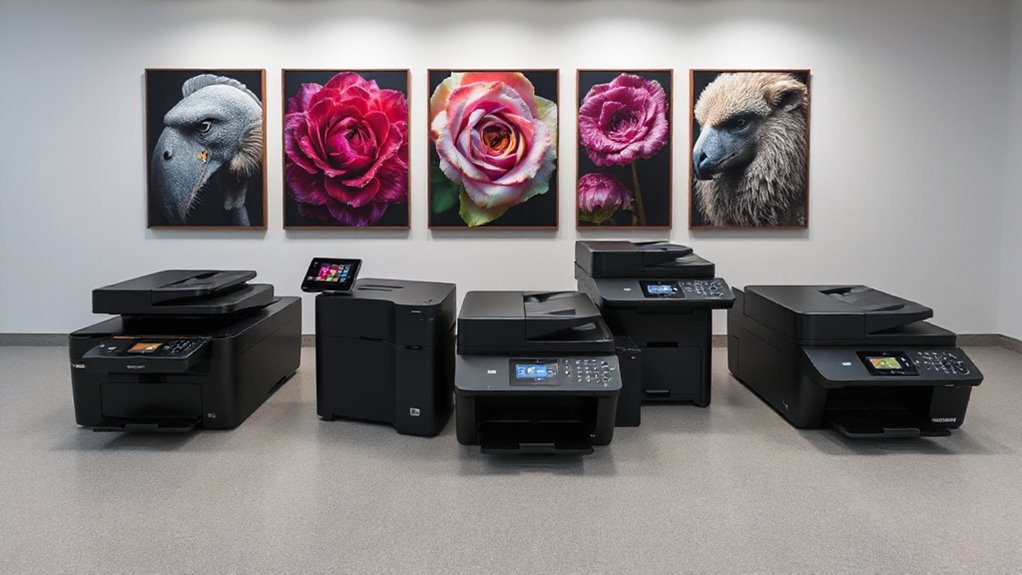 Choosing a pigment ink photo printer for fine art prints hinges largely on ink quality and color range, as these factors directly influence the longevity and vibrancy of your images. High-quality pigment inks guarantee your prints resist fading and maintain color stability over time, making them ideal for gallery displays. A wide color gamut is essential for capturing the subtle nuances and fine details in art reproductions, resulting in richer, more vibrant images. Many top printers include multiple black inks and specialty shades, enabling nuanced tonal ranges and deep, true blacks. Consistent ink formulation guarantees uniform color reproduction across different print runs, minimizing shifts that could distort your artwork’s integrity. Ultimately, choosing a printer with superior ink quality and an extensive color range ensures your fine art prints will look stunning and last for generations.