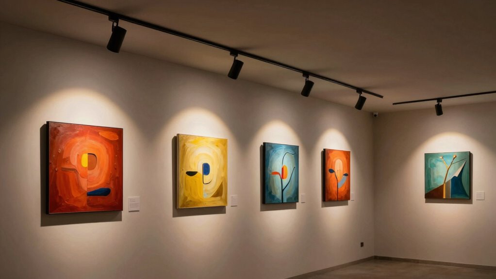 Choosing the right gallery lighting is like finding the perfect spotlight for a star—it highlights their best features and sets the mood. I once struggled with dim lighting that dulled my artwork’s brilliance, but switching to a professional dimmable light transformed my space. Remember, the right lighting isn’t just about brightness; it’s about showcasing your art’s true colors. Invest wisely, and your gallery will shine brighter than ever.