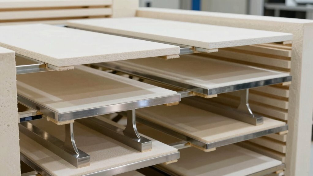 Material types greatly influence kiln furniture durability, much like choosing the right armor for a battle. Refractory ceramics withstand high temperatures and resist thermal shock, making them durable for frequent firing. On the other hand, softer materials like alumina are more fragile but excel in specific applications. Selecting the right material depends on your firing needs, ensuring longevity and performance in your kiln operations.