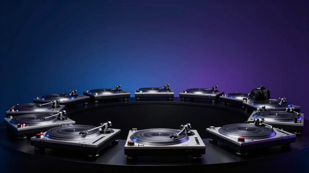 Imagine a lighthouse guiding ships safely through foggy nights—that’s how these turntables perform in low-light photography. They’re equipped with powerful, adjustable LED lighting and smooth rotation to minimize shadows and highlight details. I’ve found they excel in dim environments, providing consistent, flicker-free illumination. With their precision and reliability, you can confidently capture sharp, professional images even when lighting conditions are less than ideal.