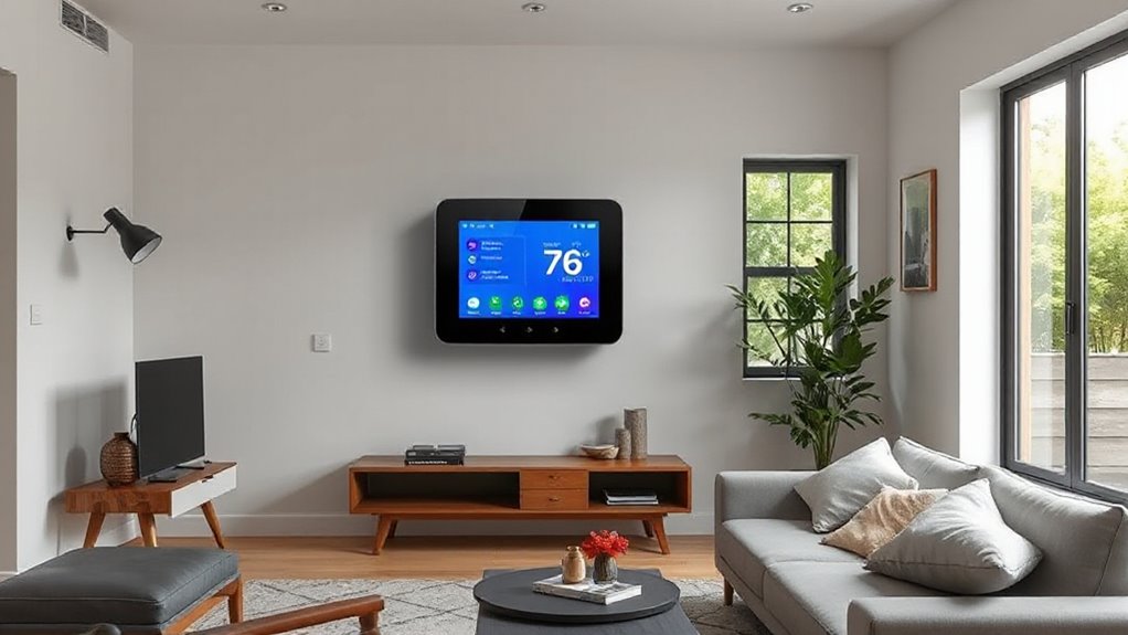 Energy efficiency is a top priority when selecting a smart thermostat, and many models now come equipped with features that help reduce your home’s energy consumption. Customizable scheduling and adaptive learning optimize heating and cooling patterns, minimizing waste. Occupancy sensors and geofencing automatically adjust settings based on room presence and your location, ensuring energy isn’t wasted when you’re away. ENERGY STAR certification is a clear indicator that a thermostat meets strict efficiency standards, helping lower utility bills. Advanced features like demand response participation allow the thermostat to reduce energy use during peak periods. Remote control capabilities give you the power to monitor and adjust settings from anywhere, ensuring your home isn’t consuming unnecessary energy when unoccupied. These features keep efficiency at the forefront of your smart thermostat choice.