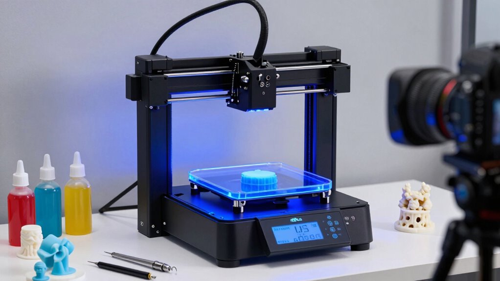 Choosing a resin 3D printer for studio work hinges considerably on its resolution and ability to capture fine details. Higher-resolution LCD screens, like 8K or 10K, produce finer details with pixel sizes as small as 17μm, resulting in smoother, more accurate models. Greater pixel density allows intricate textures and complex geometries to be printed with exceptional clarity. The layer height and XY resolution directly impact surface finish; smaller layer heights yield less visible layer lines and more precise surfaces. Advanced light sources and optimized exposure times enhance detail reproduction by ensuring uniform curing across small features. Using high-resolution resins and compatible printers reduces post-processing needs, saving time and improving overall print quality. These factors are essential for delivering highly detailed, professional results in a studio setting.
