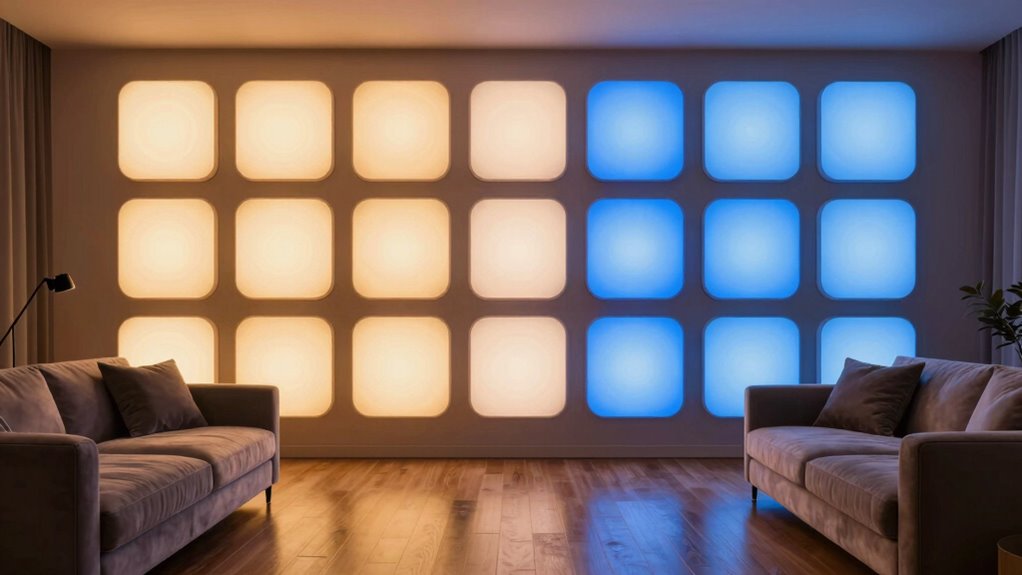 A smart lighting system’s brightness and dimming range considerably impact your ability to create the perfect ambiance. A wider range, like 0-100%, offers precise control over light intensity, helping you tailor lighting for different activities and moods. It’s important that brightness adjusts in small increments, around 1-5%, to allow smooth transitions and fine-tuning. Flicker-free operation at low brightness levels is vital to prevent eye strain and ensure visual comfort. Compatibility with dimmable bulbs is a must, as non-dimmable versions can’t be adjusted and risk damage. Additionally, look for systems that maintain consistent brightness control across the entire range, avoiding sudden jumps or inconsistencies. These factors guarantee you can achieve the desired atmosphere effortlessly and comfortably.