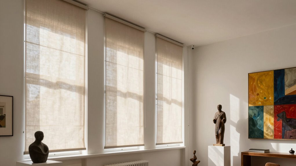 Think of solar shades as guardians shielding your artwork from harmful UV rays, like a knight in shining armor. Yes, there are specific shades designed with UV-blocking coatings that prevent damage while still allowing light to filter in beautifully. These shades act as a protective barrier, ensuring your art remains vibrant and preserved over time. Choosing the right UV-protective shades is essential to keep your masterpieces safe and stunning.