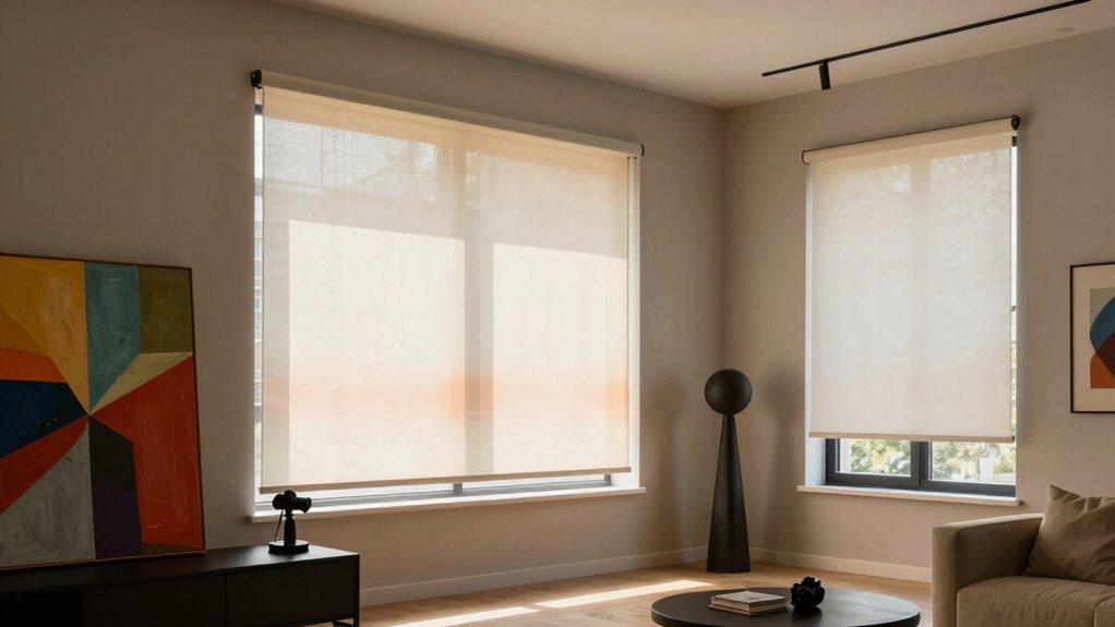 Choosing the right solar shades for an art room hinges on understanding your light filtering needs, as these shades directly influence how artwork is viewed and protected. Light filtering shades can cut down glare by up to 85%, making it easier to see details without distortion. Fabrics with 1% to 5% openness strike a balance between letting in natural light and blocking UV rays that fade art colors over time. Semi-sheer shades are excellent for diffusing harsh sunlight while maintaining daylight entry, creating a soft, inviting atmosphere. Properly selected shades provide enough light for appreciation without risking UV damage. In essence, your choice depends on how much natural light you want and how well you want to preserve your artwork’s vibrancy.