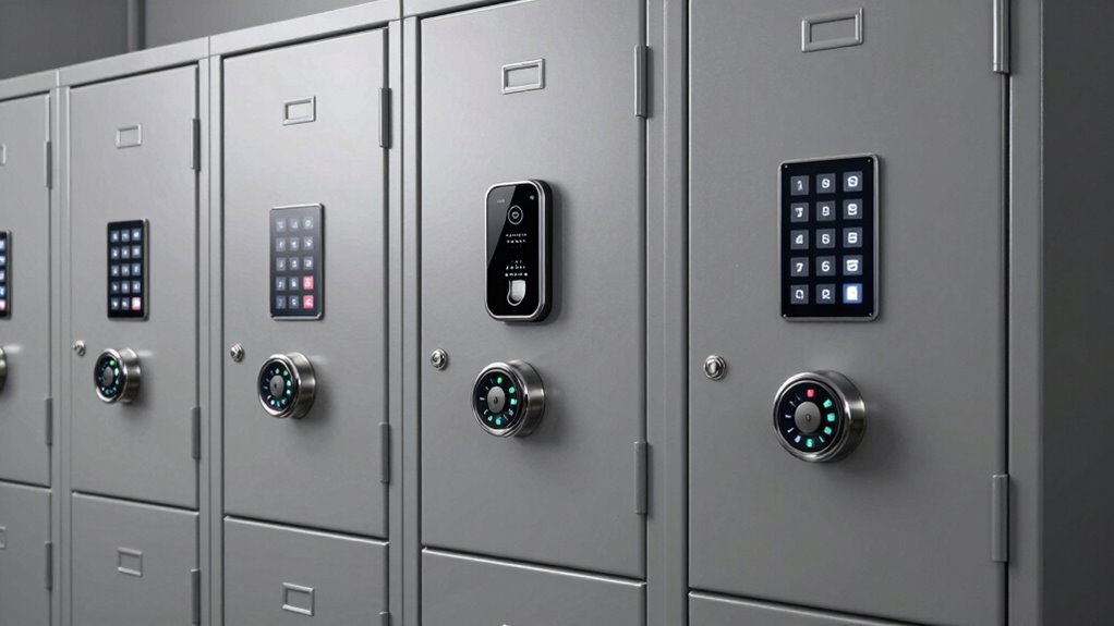 Choosing the right locking mechanism for a steel storage locker depends on several factors, including security level, ease of use, and the environment where it’s installed. Key locks are straightforward, using a physical key, and are reliable for basic security. Digital locks offer keyless access through keypads or biometrics, providing convenience and programmability, ideal for high-traffic areas. Combination locks rely on a numeric code, eliminating the need for keys and reducing the risk of loss. Three-point locking systems engage multiple points simultaneously, considerably boosting security and resistance to forced entry. When selecting a lock type, consider how much security you need, how users will access the locker, and environmental factors like moisture or temperature. The right choice balances safety, practicality, and durability.