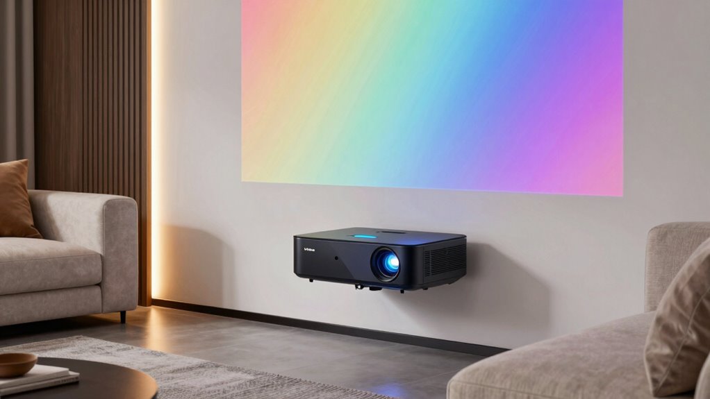 To achieve true-to-life images, color accuracy is a crucial factor when selecting an ultra short throw 4K projector. Technologies like RGB laser systems deliver vibrant, precise colors without the artifacts seen in traditional projectors with color wheels. Wide color gamuts such as BT.2020 or DCI-P3 expand the color spectrum, making images look more vivid and realistic. Advanced tone-mapping and processing algorithms further refine color fidelity and contrast, ensuring the projected image closely matches the original content’s hues. Support for HDR formats like Dolby Vision and HDR10 enhances color depth, brightness, and contrast, boosting visual realism. Additionally, pure laser light sources help maintain consistent color accuracy over time, avoiding color shifting and ensuring your viewing experience remains accurate and stunning throughout the projector’s lifespan.