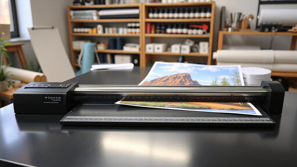 Portability and ease of use are crucial factors to contemplate when choosing a wide format paper cutter for large prints. Lightweight models, often under 20 pounds, make transportation simple, especially for those who need to move their cutter frequently. Features like ergonomic handles and straightforward locking mechanisms minimize user fatigue and streamline operation. Compact designs with built-in stands or minimal footprints allow for easy storage and setup in various workspaces. Manual systems with clear measurement grids enable quick, precise adjustments without complex controls. Adjustable components and user-friendly interfaces ensure that even those with limited training can perform large-scale cuts efficiently. Prioritizing portability and ease of use helps maximize productivity while maintaining convenience, especially in dynamic or space-constrained environments.