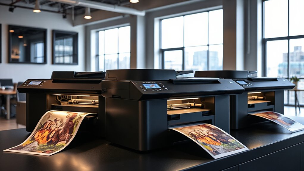 Speed and productivity are crucial factors when selecting a wide format photo printer for a small business. High-speed printers can produce large-format prints quickly, boosting overall efficiency. Features like automatic duplex printing and large input/output capacities help reduce manual tasks and minimize downtime. Fast first-page-out times are essential for quick turnaround on urgent projects and client orders. Efficient workflow options, such as multiple paper trays and automated media handling, streamline high-volume printing tasks. Additionally, optimized printing speeds for different media sizes ensure you meet tight deadlines without sacrificing quality. Prioritizing these features enables your business to handle demanding printing schedules smoothly, increasing productivity and allowing you to serve clients more effectively.